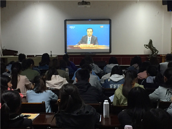 为引领青年学生深入学习贯彻党的十九大精神和习近平新时代中国特色社会主义思想,牢固树立“四个意识”,坚定“四个自信”,使青年学生关心政治,参与政治,并激发他们的外语学习热情,学习榜样,模仿楷模,4月16日晚7:30,外国语学院组织英语专业大一大二两个年级的学生观看学习了十三届全国人大一次会议闭幕后国务院总理李克强答记者问及英文同声传译视频。