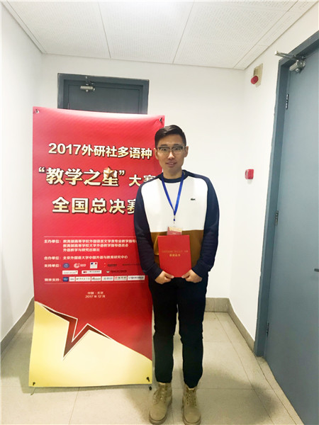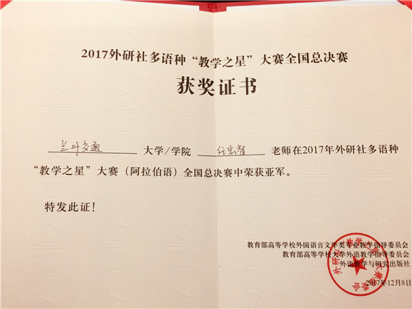 2017年12月6日-8日,2017年外研社多语种“教学之星”全国总决赛在北京外研社会议中心举行,我校外国语学院阿拉伯语系教师任宏智顺利通过初赛、复赛等环节,最终在全国总决赛中荣获亚军称号。