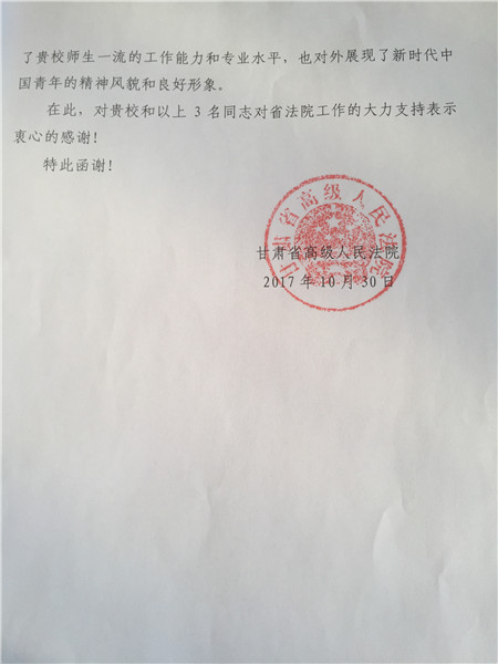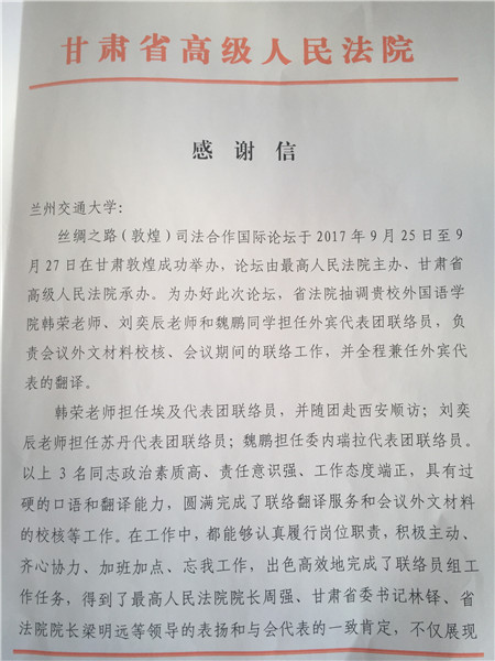 韩荣老师担任埃及代表团联络员,并随团赴西安顺访;刘奕辰老师担任苏丹代表团联络员;魏鹏担任委内瑞拉代表团联络员。三名师生政治素养高、责任意识强、工作态度端正、专业能力过硬,在工作中认真履行岗位职责,积极主动、齐心协力、加班加点、忘我工作,圆满完成了联络翻译服务和会议外文材料的校核等工作,得到了最高人民法院院长周强、甘肃省委书记林铎、省法院院长梁明远等领导的表扬和与会代表的一致肯定,省法院特此发来感谢信。我校师生高质量完成丝绸之路(敦煌)司法合作国际论坛外宾代表团联络员工作,不仅展现了一流的工作能力和专业水平,也对外展现了新时代中国青年的精神风貌和良好形象。