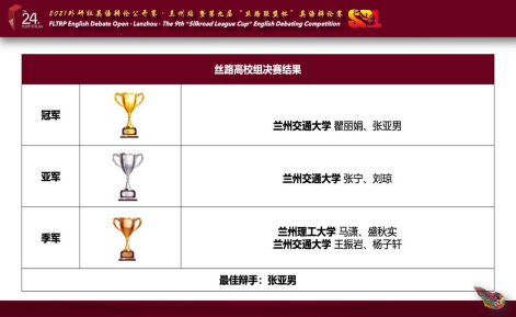宏辞论道展才思,慧辩立言抒己见。11月19日至11月20日,2021年外研社英语辩论公开赛·兰州站暨第九届“丝路联盟杯”英语辩论赛在云端落下帷幕,我校英语辩论队包揽丝路高校组冠亚季军。外国语学院2019级英语口译专业瞿丽娟和张亚男同学、2019级笔译专业刘琼和张宁同学、2019级英语专业杨子轩和2020级英语专业王振岩同学组成的代表队分别获得了本次大赛“丝路高校组”的冠亚季军,2020级英语专业何家乐和张碧天同学获得此次大赛二等奖。