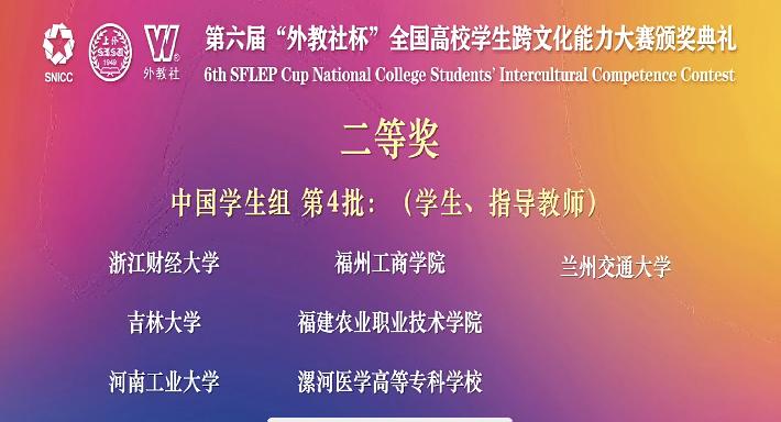 12月3日,第六届“外教社杯”全国高校学生跨文化能力大赛全国总决赛在湖南师范大学举行。由我校学子陈晓奇(外国语学院)、王雯月(文学院)、高榕曼(文学院)组成的参赛团队在学校及外国语学院的大力支持和悉心指导下,荣获二等奖。