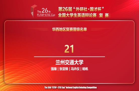 4月20-21日,第26届“外研社·国才杯”全国大学生英语辩论赛华西地区复赛在互联网云端落下帷幕。由外国语学院强臻、张亚锋老师带队,葡萄牙语2201班冯卉仪和西班牙语2201班杨帆同学组成的代表队获得华西区复赛一等奖,以优异成绩成功晋级全国总决赛。
