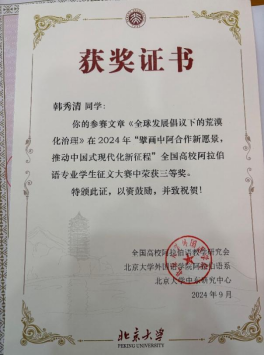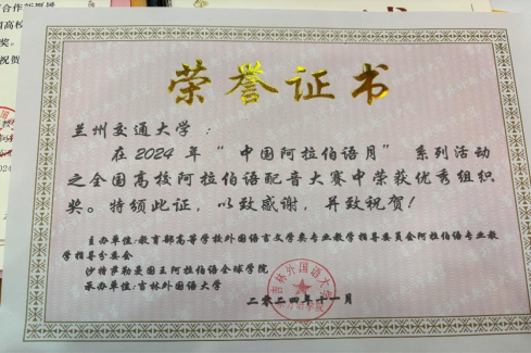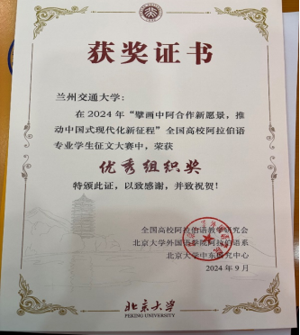 近日,在2024年教育部高等学校外国语言文学专业教学指导委员会阿拉伯语分委会年会上,颁发了“2024年全国高校阿拉伯语专业学生征文大赛”和“2024全国高校阿拉伯语配音比赛”的获奖证书。