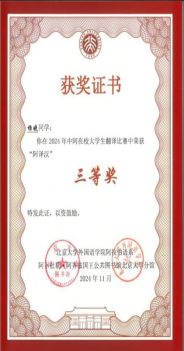 在2024年第二届中阿在校大学生翻译比赛中,我院阿拉伯语系21级学生杨晓、陈悦、马建明获得阿译汉组三等奖。本次比赛由北京大学外国语阿拉伯语系和阿卜勒•阿齐兹国王公共图书馆北京大学分馆联合主办,大赛吸引了来自中国和阿拉伯国家25所院校的200多位同学参与,展示出全国阿拉伯语专业学子的学习热情。大赛共分为阿译汉、汉译阿2个组别,允许国内外在校大学生积极参与,旨在加强中外文化交流合作,通过赛事培养更多优秀翻译人才,加强中外青少年文化交流。