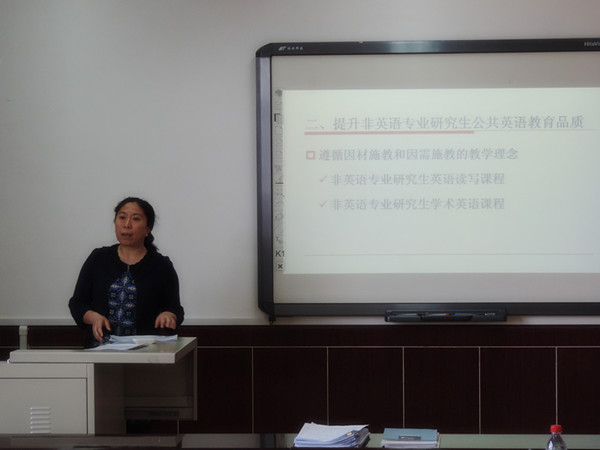 余莉院长做了学院学科学位建设和研究生教育工作的“十三五”规划汇报。汇报从发展目标、非英语专业研究生公共英语教育品质、英语专业研究生培养及学科学位建设四个方面进行。