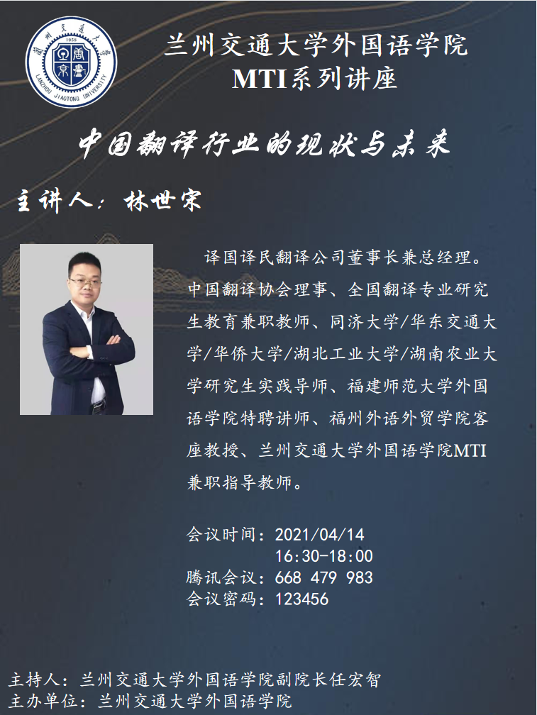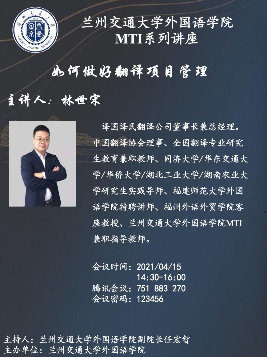 2021年4月14日—15日,译国译民翻译公司董事长兼总经理、中国翻译协会理事、兰州交通大学外国语学院MTI兼职指导教师林世宋受邀为我院MTI专业任课教师及全体MTI研究生分别作了题为“中国翻译行业的现状与未来”、“如何做好翻译项目管理”两场线上主题讲座,本次讲座由外国语学院副院长任宏智担任主持。