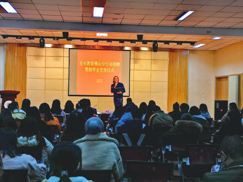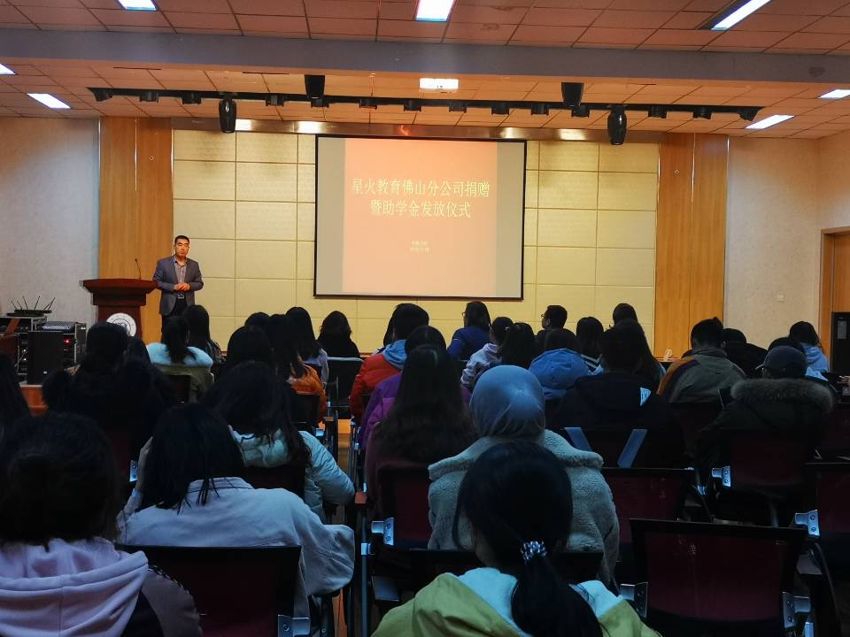 在主持人介绍完出席活动的领导嘉宾之后,外国语学院党委副书记、副院长王一君代表外国语学院对星火教育慷慨解囊的捐资助学义举表示衷心感谢并代表学院接受了星火教育科技有限公司佛山分公司的捐赠。星火教育科技有限公司佛山分公司梁俊总经理对我院学生的专业素养给予了高度肯定,表达了对我院人才培养的关注和与我院长期合作的意愿,同时向本次受资助的学生发放了助学金,鼓励同学们好好学习,在学习和工作中磨练自己,不断成长。