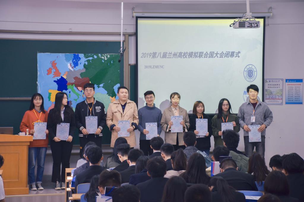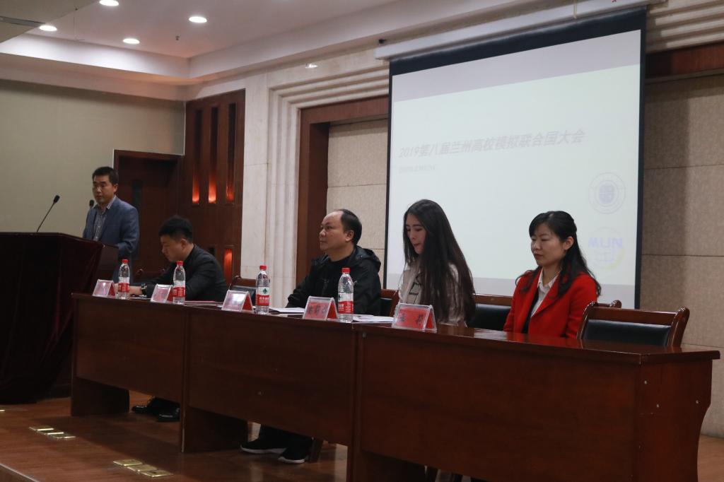 第八届兰州高校模拟联合国大会于2019年11月8日至10日在兰州交通大学举行,本次活动由共青团兰州市委,共青团兰州交通大学委员会,兰州交通大学外国语学院主办,兰州交通大学模拟联合国协会承办。共青团兰州市委志愿者工作部吴永朝、兰州交通大学学生社团联合会秘书长安舒窃、兰州交通大学外国语学院副院长王一君出席了开幕式并做致辞,兰州交通大学外国语学院团委书记冯玉才、兰州交通大学模拟联合国协会指导教师王莉出席了本次大会开幕式并向各委员会主席授象征着秩序、权威,实力与智慧的法官锤。本次大会吸引了来自;北京师范大学,西北大学,湖南师范大学,中南林业科技大学,东华理工大学,西北工业大学,新疆大学、兰州大学、兰州交通大学,甘肃政法大学,西北师范大学,甘肃农业大学,西北民族大学,兰州财经大学14所省内外高校共计130名学生的参与。开幕式结束后部分代表与嘉宾进行合影留念。