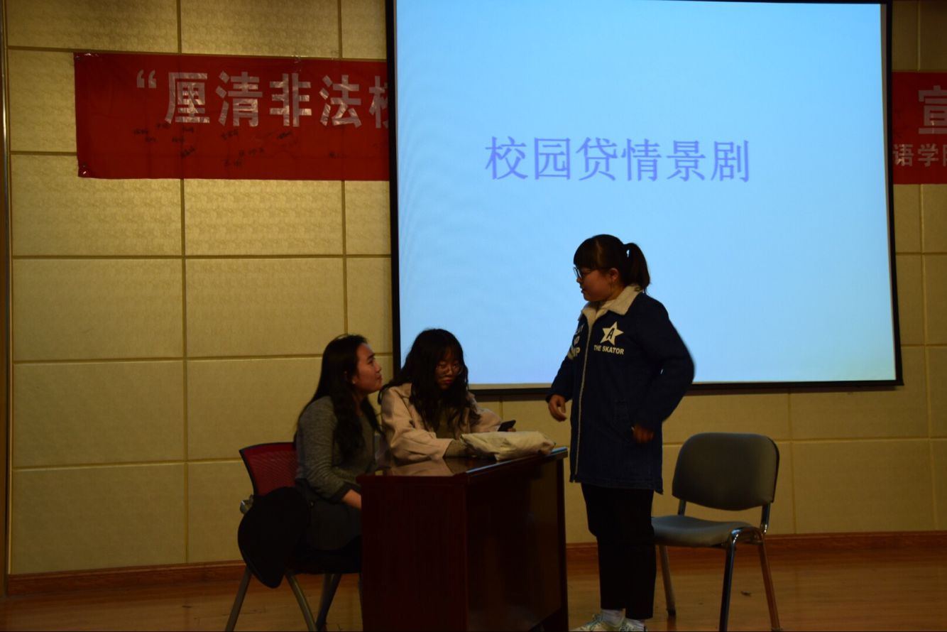 11月16日下午4点,外语学院团委学生会在实训室举办了“厘清非法校园贷,树立健康金钱观”宣讲活动。外国语学院党委副书记、副院长王一君老师、院团委、教务办、18级班主任和18级全体同学参加了本次活动。本次活动包括发放宣传资料、“拒绝校园贷”签名活动、校园情景剧展示、学生案例讲解四个部分。