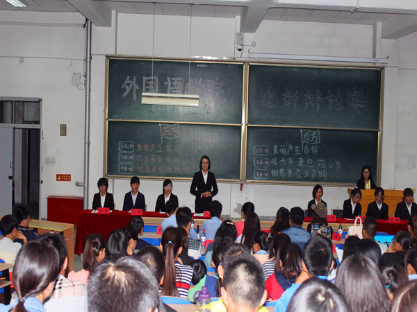 为了发掘和培养辩论人才,增进各班之间的联系和交流,丰富大一新生的课余生活,外国语学院在9月下旬至10月上旬举办了2014级迎新辩论赛。比赛分初赛、复赛、决赛三场,历时一个月,来自14级的六个代表队参加了本届比赛。经过为期三周的赛前培训,比赛中辩手们各发挥出色、配合默契。