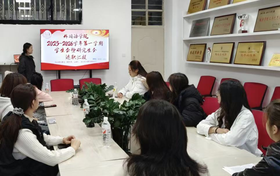 为深入贯彻《关于深化高校学生会(研究生会)改革的若干意见》精神,全面落实《兰州交通大学学生会章程》及相关工作细则,为全面总结本学期工作成效,科学规划下一阶段发展路径,切实提升外国语学院学生会的组织凝聚力、工作执行力与服务贡献度,进一步激发全体工作人员履职尽责、担当作为的内生动力。外国语学院于2025年11月21日(星期五)16:30在8-D-417会议室召开2025-2026学年第一学期学生会及研究生会述职汇报大会。出席本次会议的有外国语学院党委副书记、副院长杨晖,外国语学院团委书记杨清秀以及学生会、研究生会全体负责人。