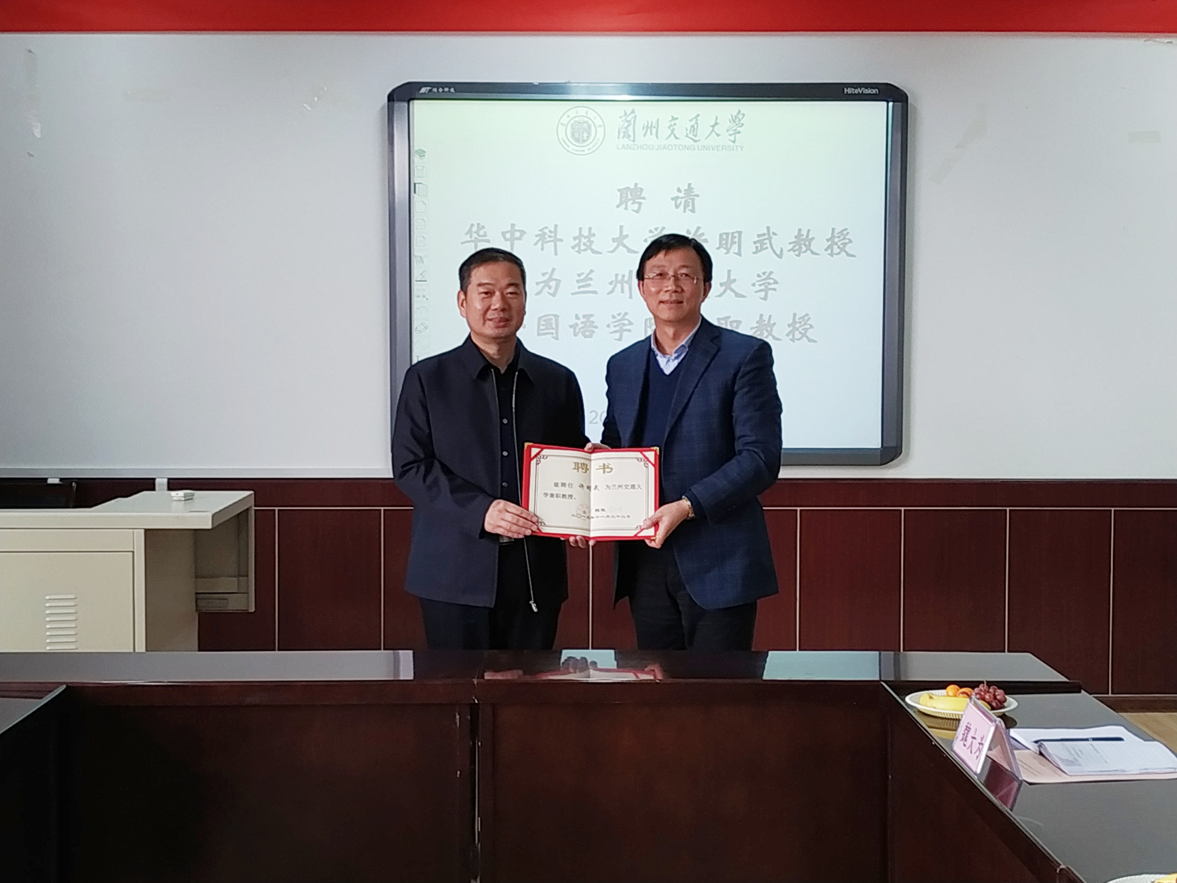 12月13日下午,我院在学术厅举行仪式,聘请华中科技大学外国语学院院长许明武教授担任我院的兼职教授。党建武副校长出席了仪式并为许明武教授颁发了聘书。聘任仪式由余莉院长主持,各系、教研室主任和硕士研究生导师等共计30余人出席了仪式。