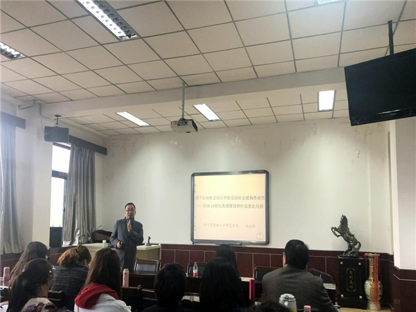 为领略前沿研究,拓宽研究视野,深化科研认知,提高我院科研水平,4月12日下午,学院邀请四川外国语大学赵永峰教授在学院学术厅举行学术讲座,讲座题目为《基于认知社会语言学的话语社会建构性研究——以18-19世纪英国俚语和行话表达为例》。讲座由院长助理孔令会主持,全体教师及研究生参加了此次讲座。