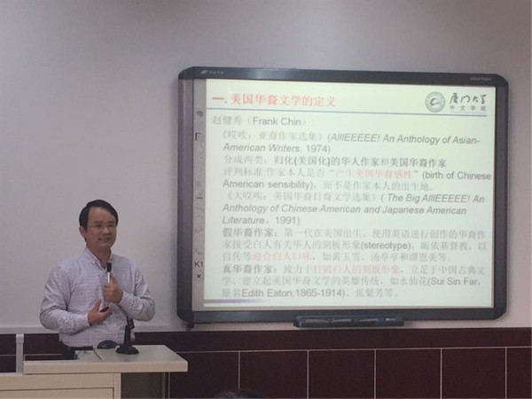 张龙海教授从美国华裔文学的定义、历史、现状,以及美国华裔文学的影响等四个方面进行阐释。他指出“美国华裔文学”是美国文学的有机组成部分,是部分与整体的关系。此外,他介绍了多部以自传、唐人街、美国梦等为主题的美国华裔文学,让大家对美国华裔文学有了更直观的认识。同时,他鼓励大家增强自身的使命意识,将中国文化和发展情况传播出去。