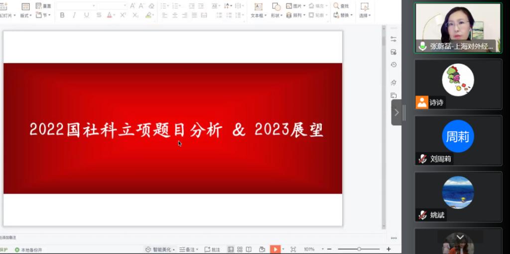 张蔚磊从外语能力、语言舆情、话语建构、中华民族共同体等热门关键词着手,结合自身经验,对文学、语言学、翻译及话语研究等学科相关国家社科立项题目与研究维度进行分析,并对2023年选题趋势做了预测。张教授建议科研工作者可以从事交叉学科的研究,通过研读国家课题指南,结合自身研究,进行改编演绎,张蔚磊还指出项目的题目可以在自己擅长的领域,结合最新趋势进行归纳。