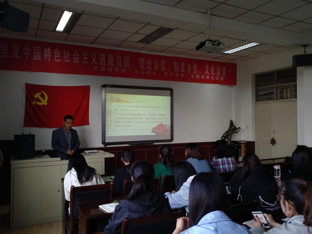 为扎实有效推进“不忘初心,牢记使命”主题教育,10月17日下午4:30,外国语学院党委在学院学术厅举办讲党课活动。学院党委副书记、副院长王一君以“牢记初心使命,做新时代有为青年”为主题为全体学生党员讲了一堂党课。学院全体学生党员参加了本次党课活动。