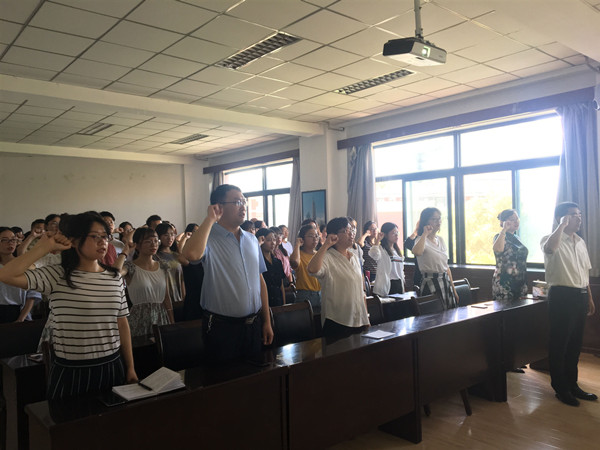 2019年6月13日下午,外国语学院新发展党员入党宣誓仪式暨教工党员重温入党誓词活动在学术厅411进行。外国语学院党委成员、全体教工党员以及新发展的30名预备党员参加了本次宣誓大会。