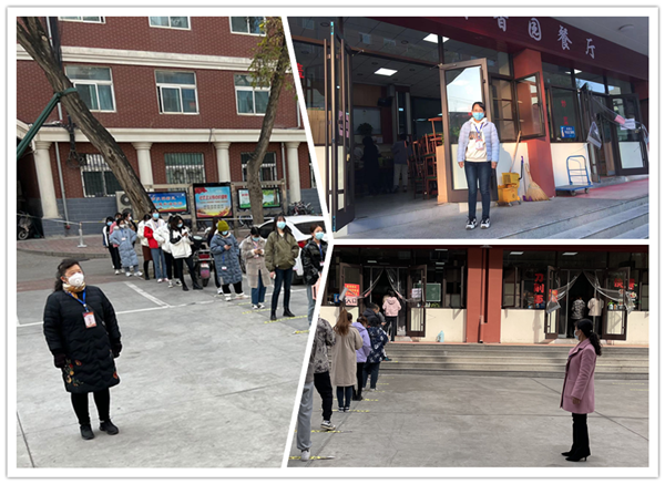 学院征集志愿者通知发出以来,教工党员们积极响应,即将退休的党员老教师带头报名,迅速成立了外国语学院教工党员志愿服务队。他们不畏严寒、不辞辛苦,在学校各餐厅值守,引导购餐学生按要求排队等候,疏散聚集人员,确保食堂就餐有序安全。