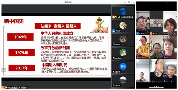 11月18日,任宏智副院长以“新中国史”为主题,为教工第三党支部讲党课。任院长分别从新中国成立、巩固政权、过渡时期、社会主义探索、文革时期、抗美援朝精神、改革开放、第三代领导集体时期、第四代领导集体时期、中国特色社会主义时代等十个时期带领党员对新中国历史进程进行了回顾,支部全体党员表示受益匪浅。