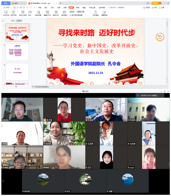 自开展党史学习教育以来,外国语学院党委将党员领导干部讲党课作为党史学习教育的重要形式和载体,紧密结合学院工作实际,适时安排党员领导干部讲党课,坚持不懈推动党史学习教育向纵深发展。党的十九届六中全会精神召开之后,学院通过中心组学习、党支部“三会一课”等多种形式,确保学深悟透全会精神实质。近期,学院把学习党的十九届六中全会精神与领导干部讲党课活动相结合,通过开展讲党课活动,持续推进党史学习教育走深走实。