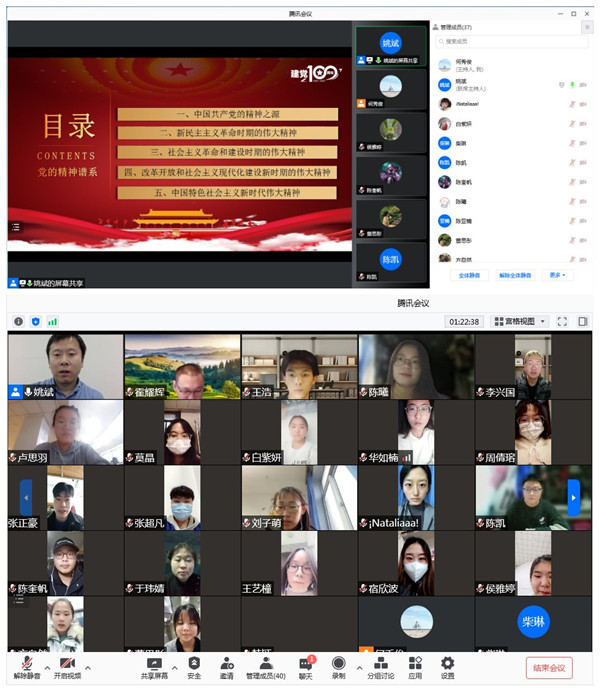 11月26日,学院党委书记姚斌为所联系的西阿语党支部讲授题为《中国共产党的“精神谱系”》的党课,讲座全面梳理了中国共产党的精神之源以及百年奋斗历程不同时期的伟大精神,重点讲解了井冈山精神、苏区精神、抗美援朝精神、西迁精神、抗洪精神和伟大抗疫精神的内涵,号召全体学生党员不负时代重托,不负青春韶华,勤奋学习,树立正确的世界观、人生观、价值观,走好人生道路,为实现第二个百年奋斗目标、实现中华民族伟大复兴的中国梦奉献自己的智慧和力量!