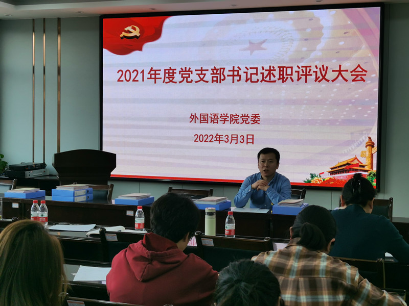 3月3日下午,外国语学院党委组织召开了2021年度党支部述职评议大会,院党委委员、各党支部书记、党员代表、群众代表等30余人参加了会议。会议由院党委书记姚斌主持。