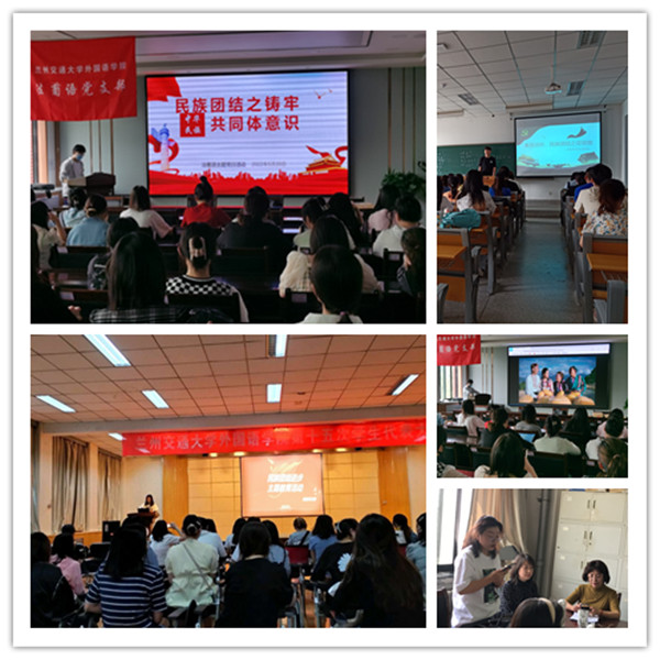 各党支部开展“中华民族一家亲,同心共筑中国梦”主题党日活动。学生党支部观看了《花开河州》、《我爱你中国(56个民族歌唱版)》等视频;学习了临夏民族特色街“八坊十三巷”,在党和国家的政策支持下,各民族群众的努力下,旧貌换新颜,从一条城中村破旧街道成为民族团结示范街的故事。教工第一党支部举办诗歌朗诵会,朗诵了《民族团结之歌》、《同是一颗心,同为一条根》、《爱我中华同一声》等作品;教工第三党支部结合专业特色,开展了“国际视角下的民族问题策略、应对、效果分析与我国民族政策对比”的研讨。各党支部通过多样的形式,引导广大师生增强“五个认同”意识,增强民族自豪感。