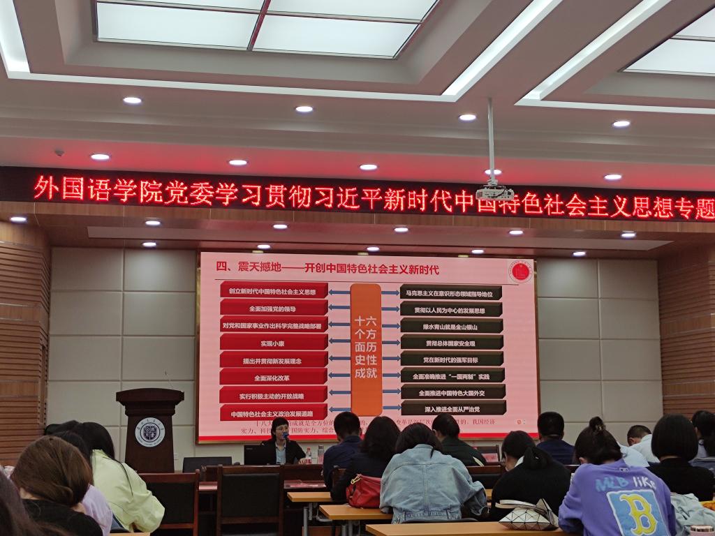 应学校党委宣传部和学院党委邀请,结合省委“三抓三促”行动要求和深入学习贯彻习近平新时代中国特色社会主义思想主题教育,5月25日下午,中共甘肃省委党校(甘肃行政学院)党的建设和领导科学教研部主任高璐佳教授在学校二教报告厅作了题为“党的百年奋斗历程”的主题教育专题党课。外国语学院师生党员和2023年上半年发展对象100余人聆听了此次专题党课。