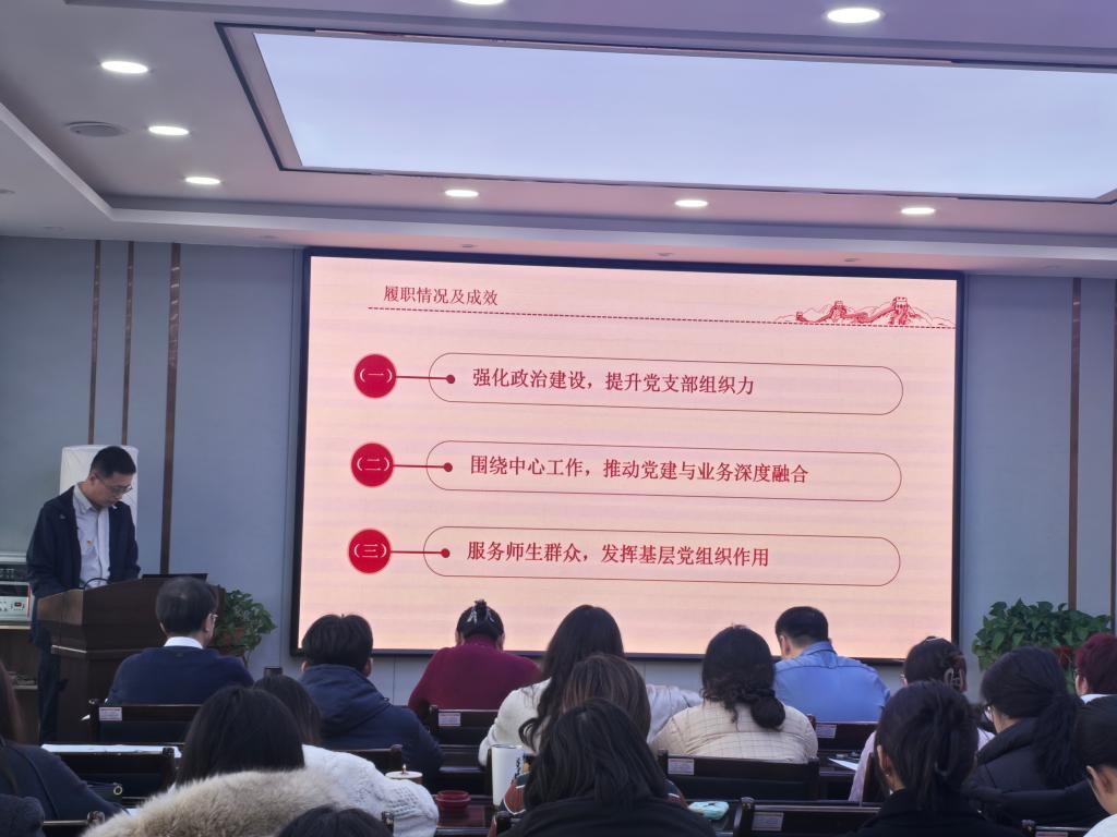 述职结束后,姚斌发表总结讲话。他肯定了各支部的工作,对各支部书记在过去一年的辛勤付出表示感谢,并对学院党支部工作提出几点要求:一是要强化政治引领,筑牢思想根基,要坚持把深入学习贯彻习近平新时代中国特色社会主义思想作为首要政治任务;二是系统谋划支部工作,切实落实支部党建第一责任人职责;三是抓好党员队伍建设,充分发挥党员先锋模范作用;四是要创新活动形式,增强党建活动吸引力;五是严肃党内政治生活,坚持全面从严治党;六要加强党支部标准化建设,提升支部党建水平;七是推动党建与业务深度融合,积极凝练支部党建工作品牌。
