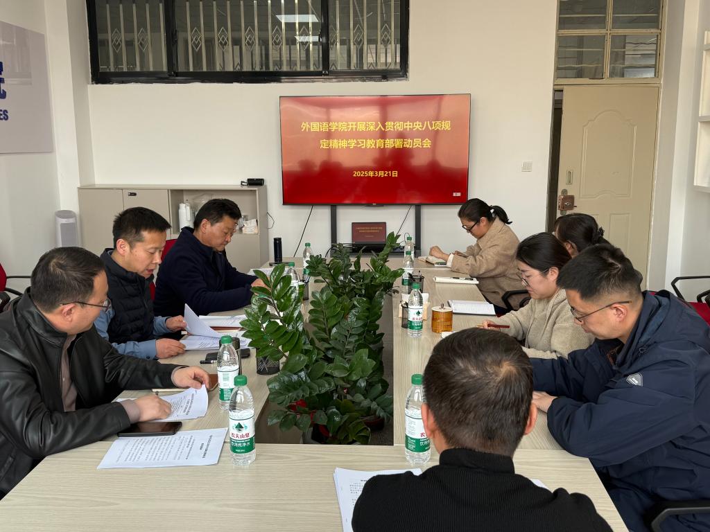 会议认真学习领会习近平总书记关于八项规定的重要论述,传达学习了中央党的建设工作领导小组会议精神、学校近期召开的党委常委会会议精神和《兰州交通大学开展深入贯彻中央八项规定精神学习教育工作方案》,审定通过了《外国语学院开展深入贯彻中央八项规定精神学习教育工作方案》。