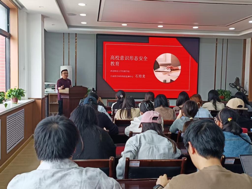本次讲座特别邀请西北师范大学传媒学院副院长、副教授,甘肃教育网络舆情监测中心常务副主任石培龙作了高校意识形态安全教育专题讲座。在讲座中,石培龙结合大量实际案例,深入阐述了意识形态的内涵,强调了意识形态安全的重要性,剖析了网络时代我国意识形态安全面临的风险和挑战,并提出了严守意识形态安全,从我做起的倡议。