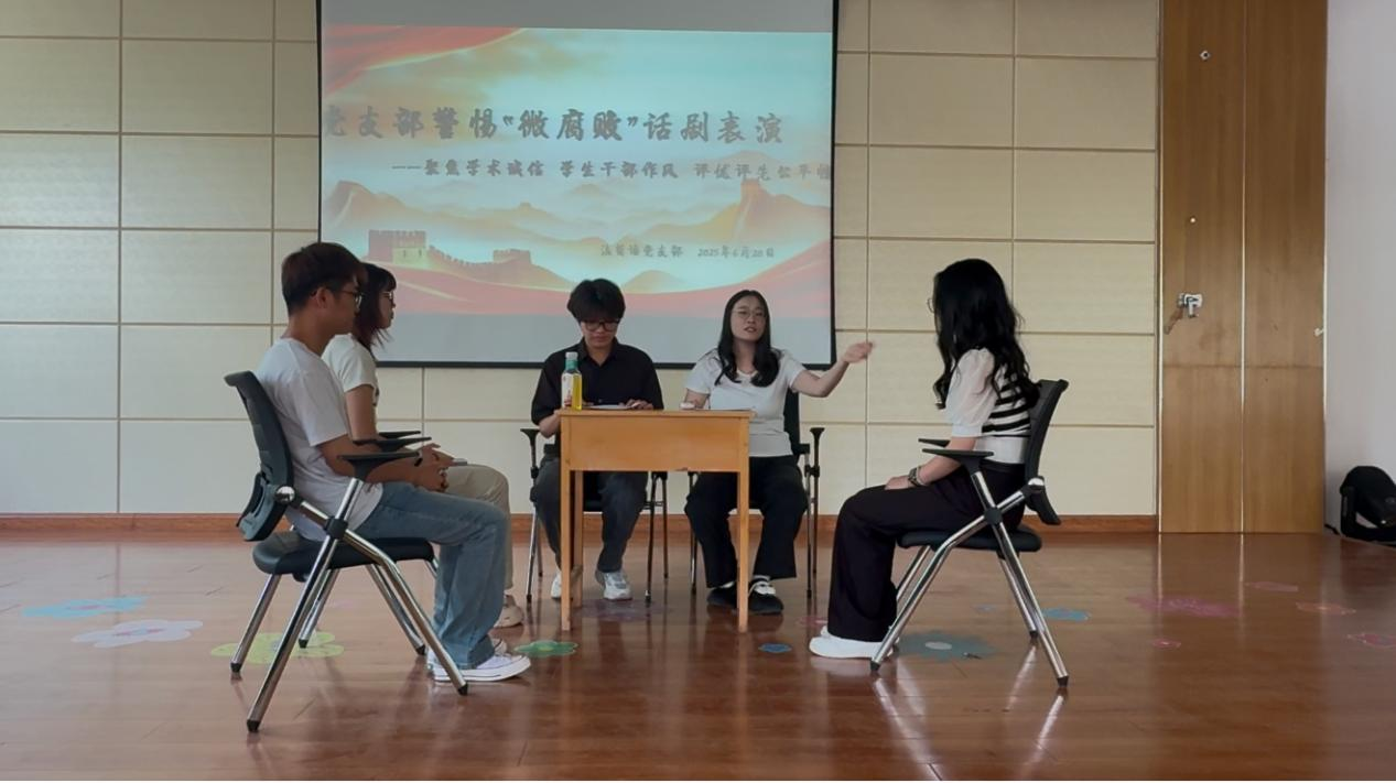 为深化党风廉政建设,增强青年党员廉洁自律意识,6月20日,法葡语党支部在八教219室举办"警惕微腐败"主题原创话剧表演活动。