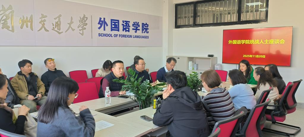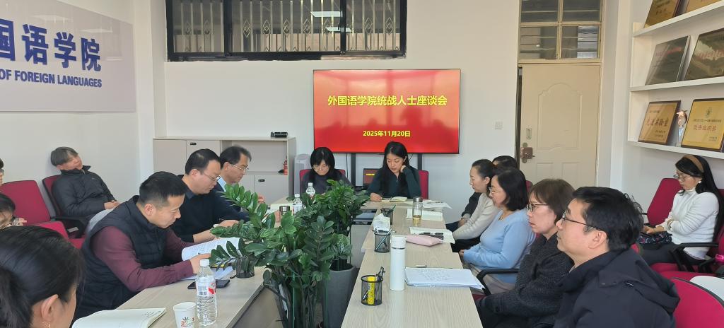 11月20日,外国语学院召开统战人士座谈会,传达学习党的二十届四中全会精神,广泛征求统战人士对学院工作的意见建议。学院班子成员、民主党派代表、少数民族教师代表、留学归国人员代表及2025年新进博士代表共20余人参加会议。会议由学院党委书记姚斌主持。