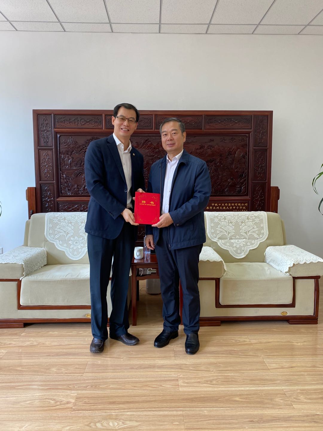 9月18日,党建武副校长在7号实验楼二楼会议室为中国建筑第六工程局发展建设公司总经理、我校外国语学院2006届英语专业毕业生杜三聪颁发MTI专业学位兼职导师聘书。党建武副校长对中建集团的业绩和社会贡献给予了高度肯定,希望双方能够开展更加深入的校企合作项目。杜三聪总经理做出了积极回应,同时表达了对母校的感恩之情。