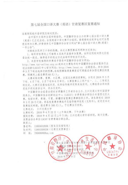 第七届全国口译大赛(英语)甘肃复赛区复赛通知