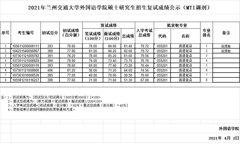 2021年MTI英语笔译调剂复试成绩公示