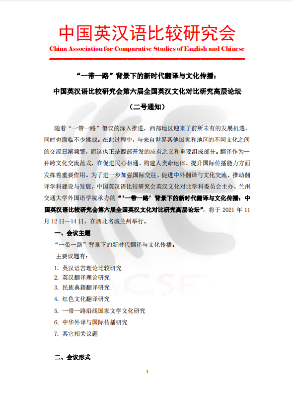 中国英汉语比较研究会第六届全国英汉文化对比研究高层论坛(二号通知)